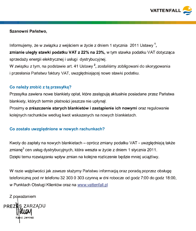 W razie wątpliwości prosimy o ponowny kontakt na adres e-mail: indywidualni@vattenfall.pl lub pod numer telefonu 32 303 0 303 dla klientów z Górnego Śląska i strefy numeru kierunkowego 32 oraz numer 801 803 303 dla klientów spoza Górnego Śląska.